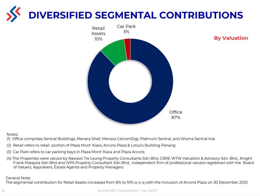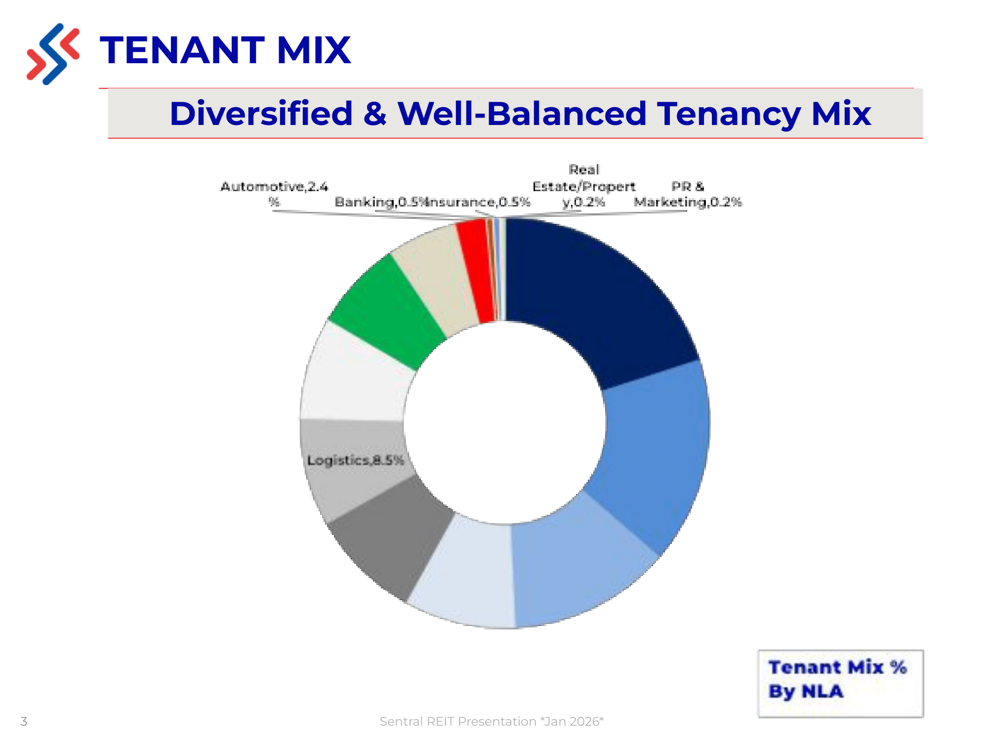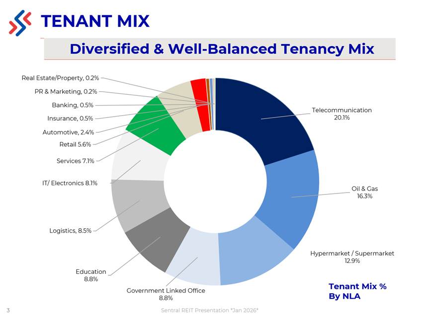 The Sentral REIT properties have a diverse mix of international and local tenants operating in a variety of business sectors as shown below :